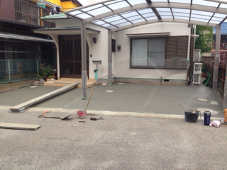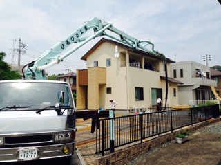 かれこれ十年近く左官修行時代からのお付き合いのある兄貴的な職人仲間 左官エクステリアのガーデンクローバー 社長さんの手伝い。午後イチ ポンプ屋さんひろひと工業 生コン8m3 平米約100m2
