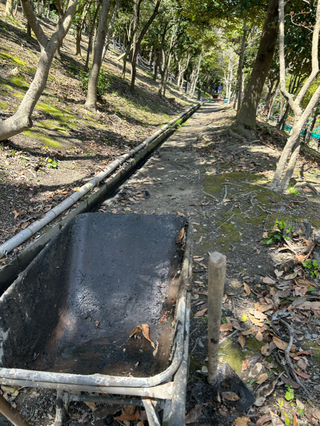 某公園では、山道でどんぐりややまももの木が沢山ある為、側溝に枯葉や土が埋まっています。