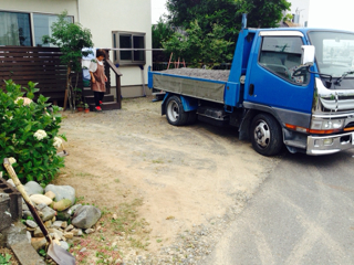 かれこれ十年近く左官修行時代からのお付き合いのある兄貴的な職人仲間 左官エクステリアのガーデンクローバー 社長さんの手伝い。午後イチ ポンプ屋さんひろひと工業 生コン8m3 平米約100m2