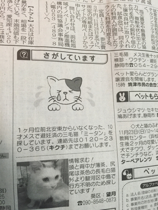 昨夜は猫ちゃん捜索ご依頼者様とスタッフ2人と みーたん捜しの目撃情報など範囲を詰めてのお話をしました。 静岡市竜南のペットプラザ様 ポスターのご協力ありがとうございました。 そして昨日の静岡新聞 新聞に載りました。 何とかご依頼者様の為にも 少しでも情報が欲しいです‥ 毎日毎日ご依頼者様と時間をずらして捜索、聞き込みしています‥